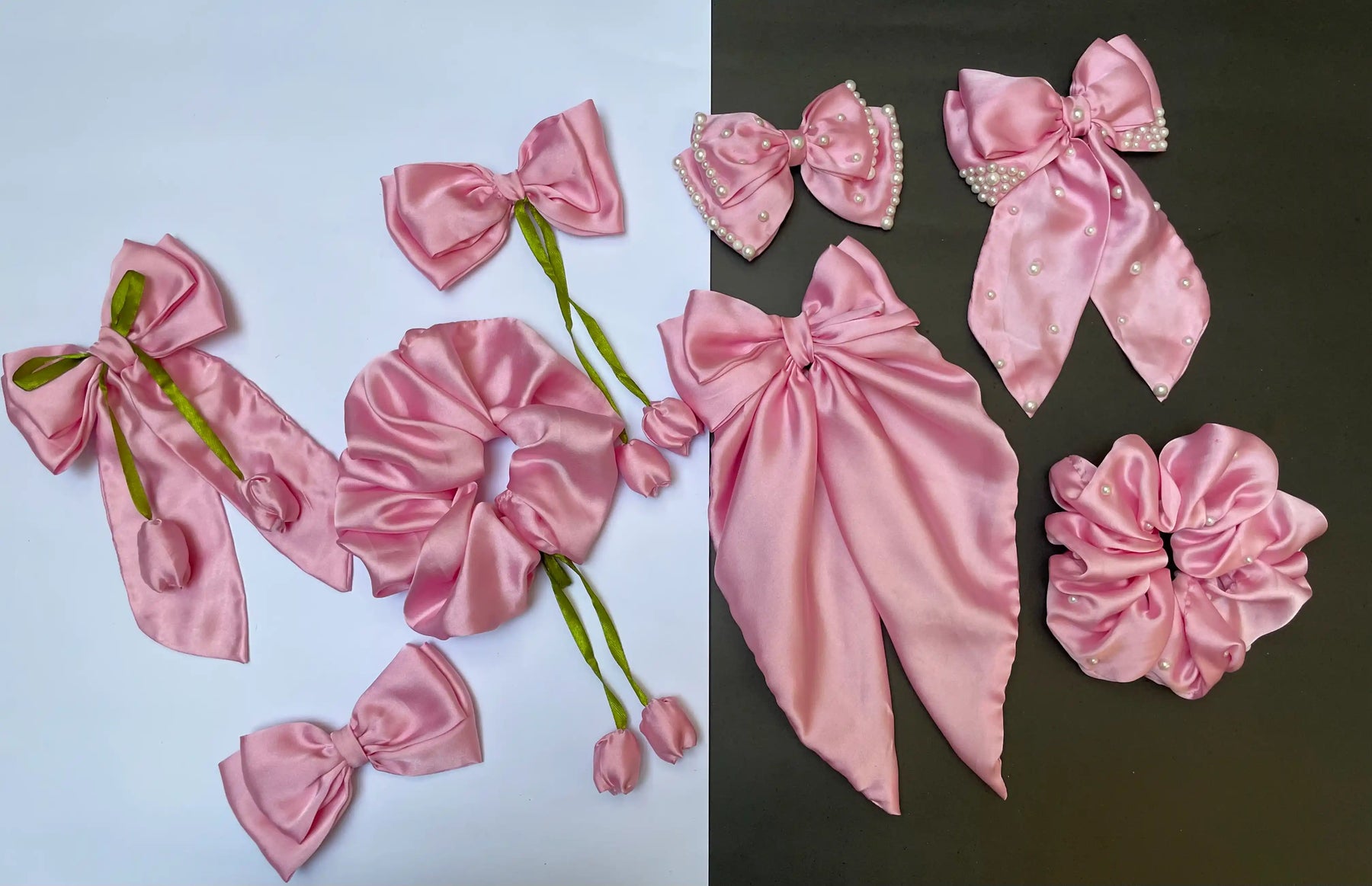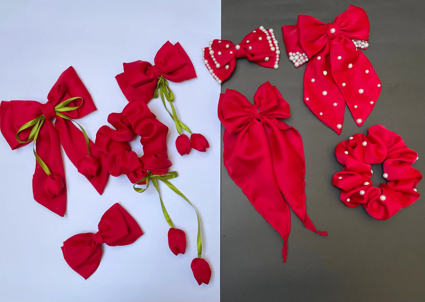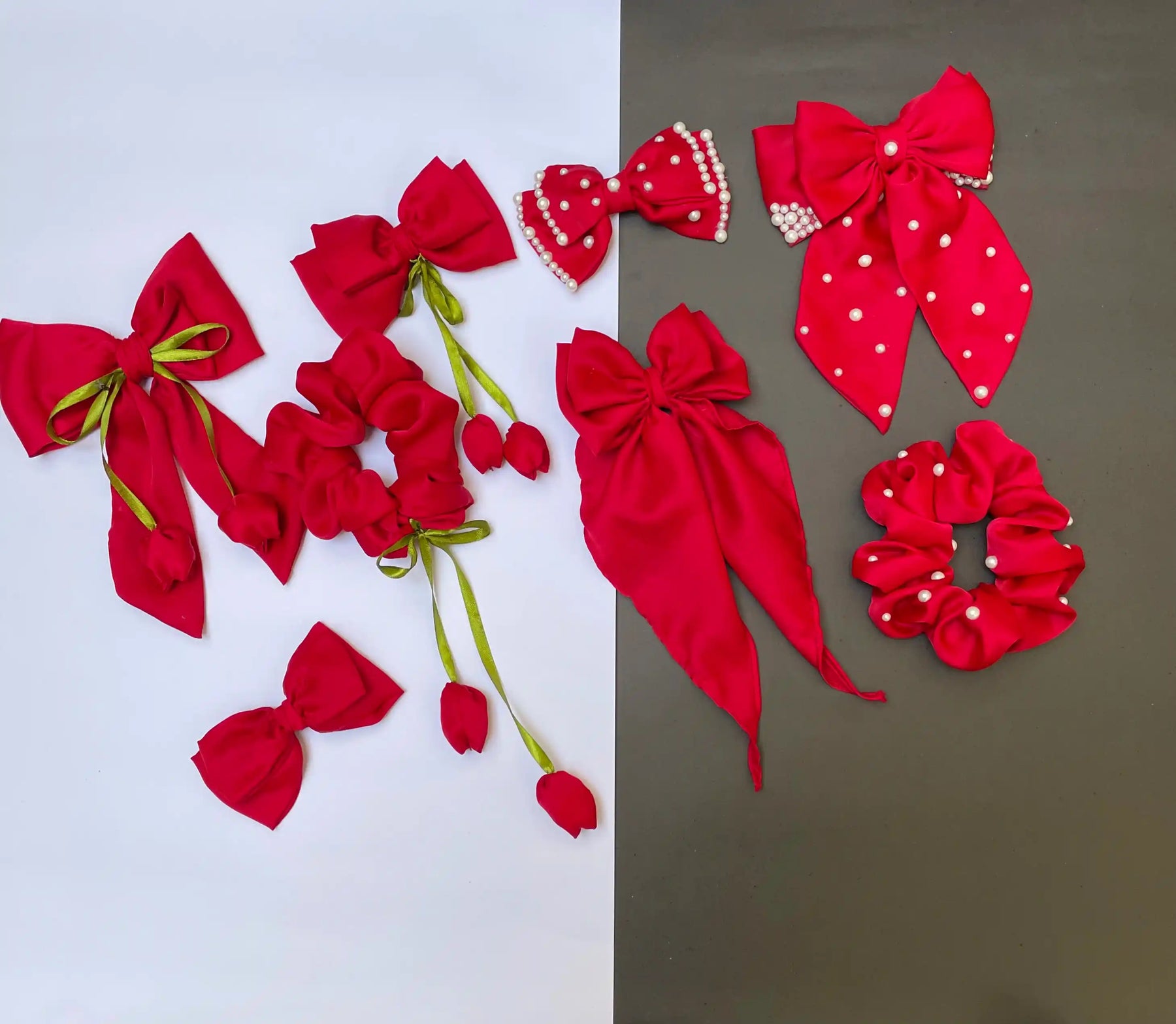 Turn heads with this vibrant 8-piece satin hair accessory set! Includes a mix of bold bows, tulip scrunchies, and pearl-studded pieces – perfect for festive looks, parties, or everyday glam.