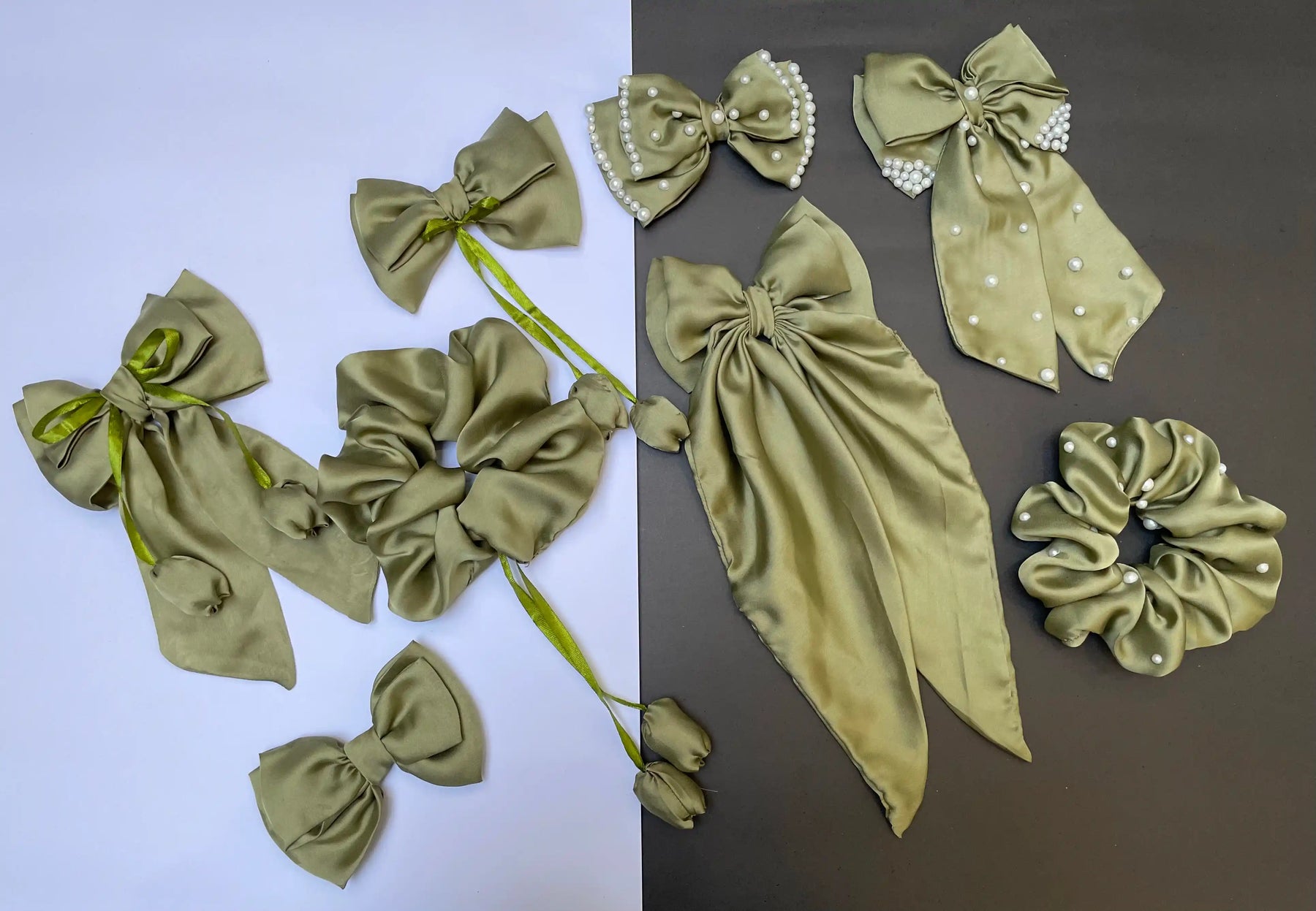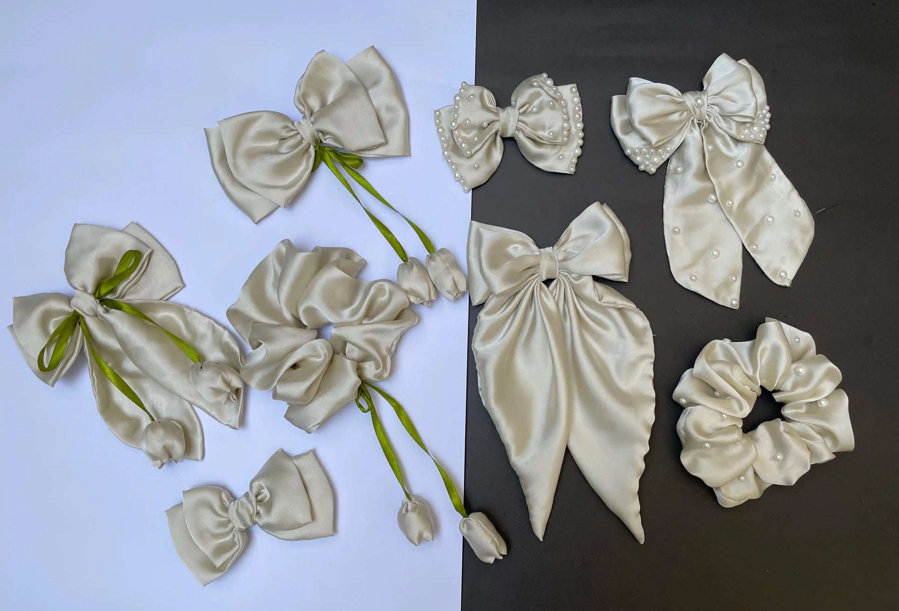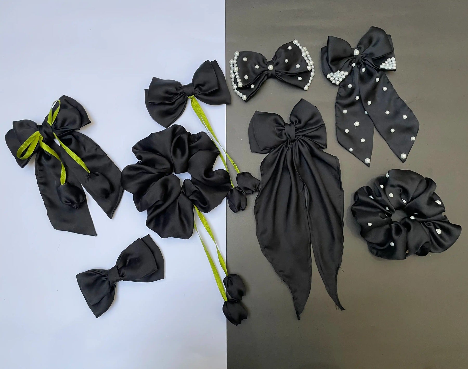 Turn heads with this vibrant 8-piece satin hair accessory set! Includes a mix of bold bows, tulip scrunchies, and pearl-studded pieces – perfect for festive looks, parties, or everyday glam.
